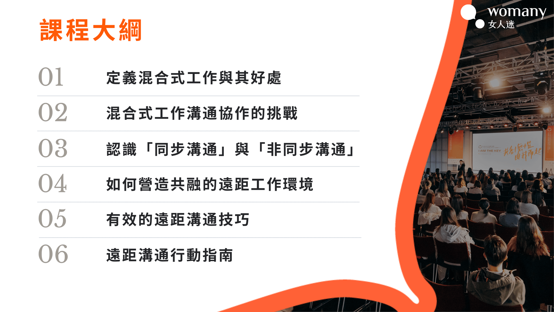 - 遠距或混合式工作所面臨的挑戰,讓學員了解正面臨的挑戰和機遇。