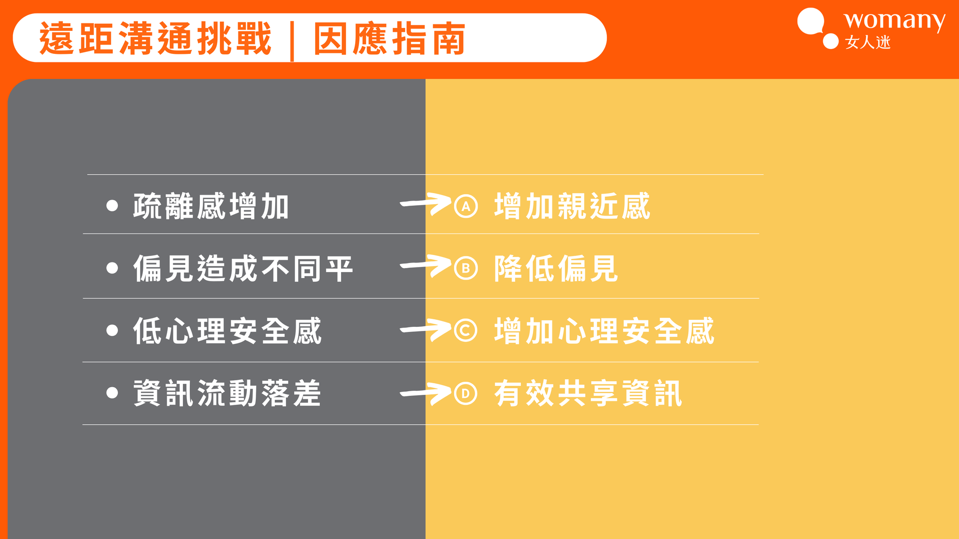 - 小試身手:建立共融遠距工作環境的建議,包括如何維持團隊文化和信任感。