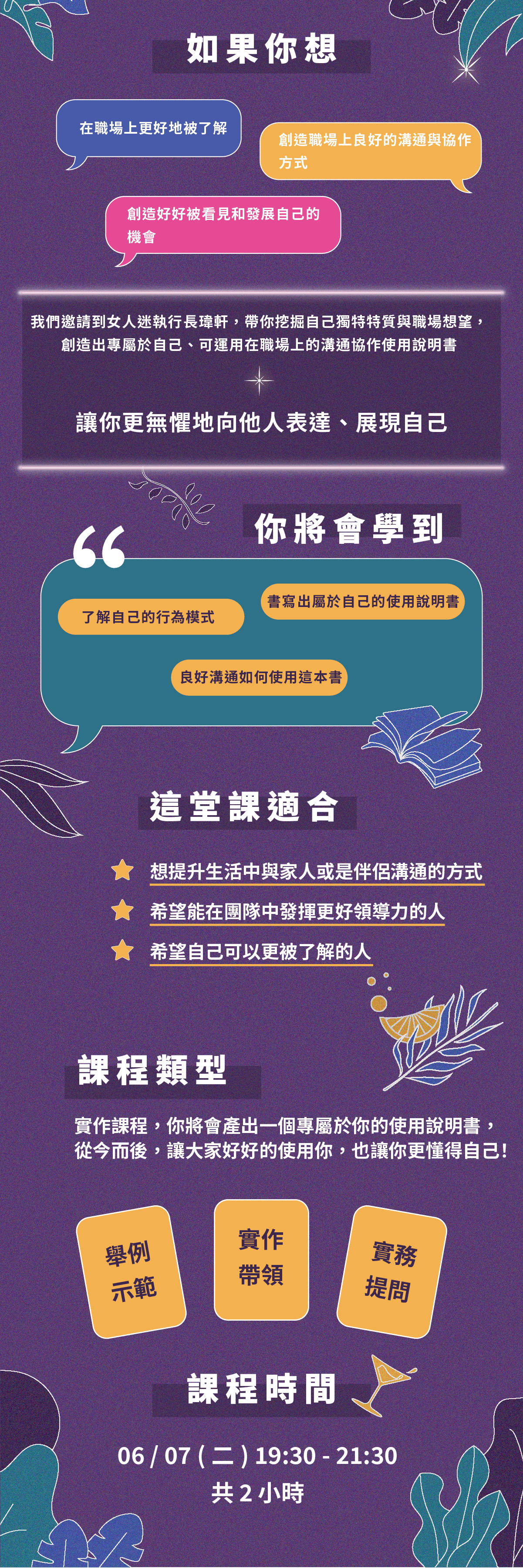 在職場上與生活中,勇敢表達、堅定提出自己的觀點與需求,是你可以更為亮眼、更為無懼地在職場發展的第一步,許多人總是擔心自己的觀點不夠好、認為他人不了解自己,卻忘記了:你或許也可以嘗試讓他人知道...怎麼好好使用你!這堂課我們將探索你的使用方式,並且它清楚地表現出來。