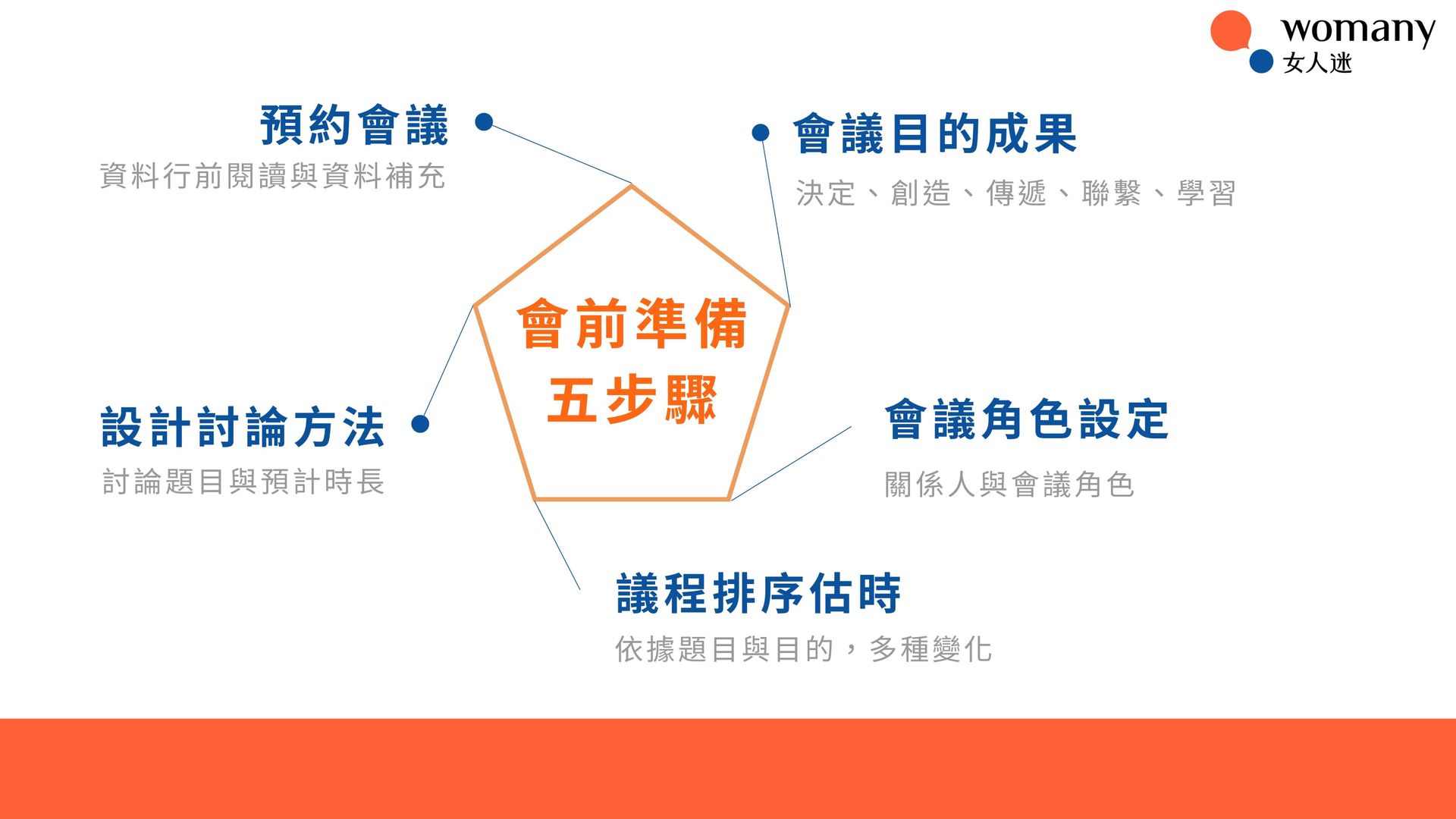 - 專注於會議的前中後三個階段,詳細說明高效共融會議的前中後階段,其中會前準備精華步驟為:會議目的、會議角色設定、議程排序、討論方法、預約時間等。