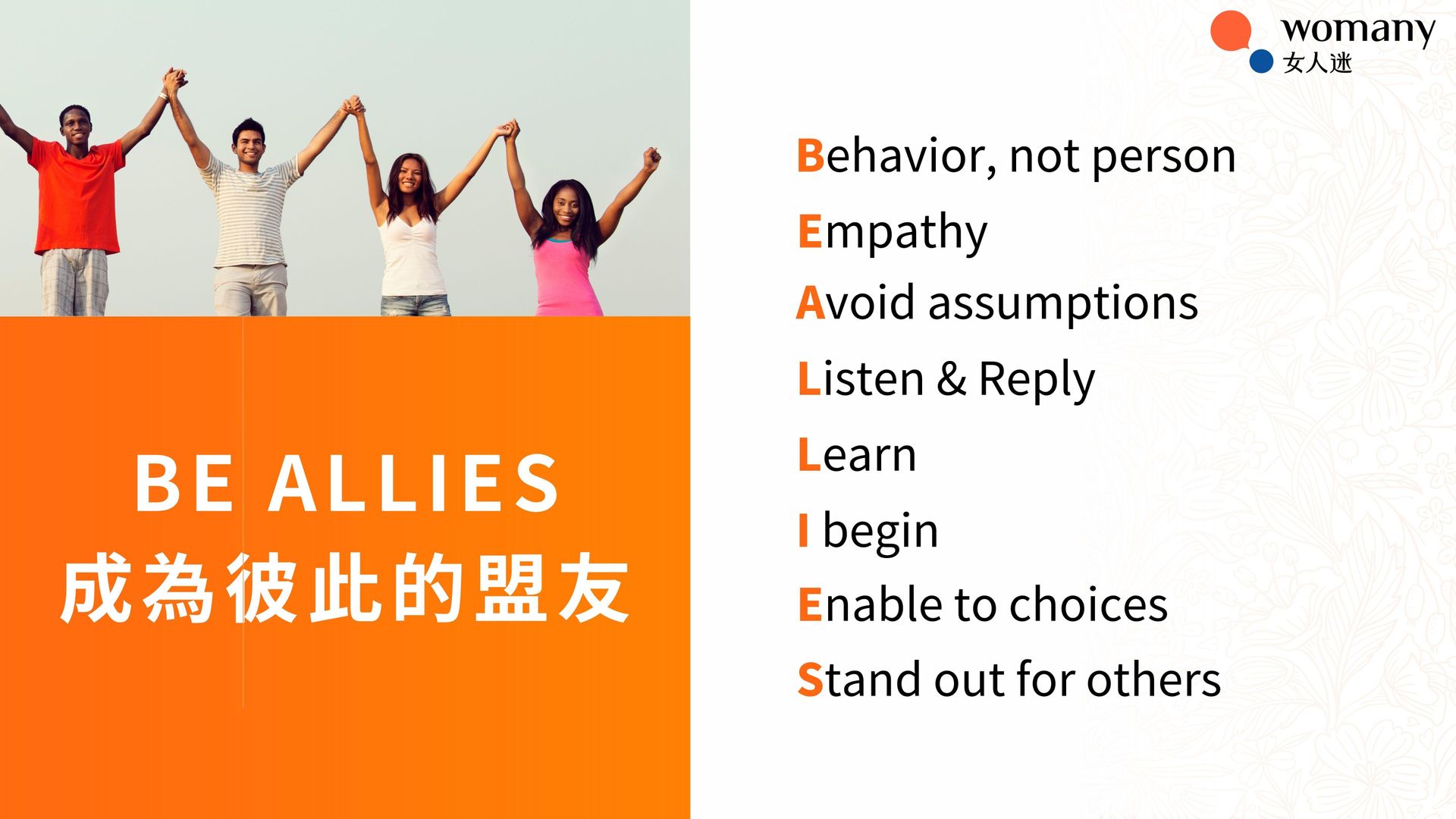 - 提供 BE ALLIES 實戰指南,透過清楚 Do&Dont’s,幫助學員在職場中促進多元共融的實踐。