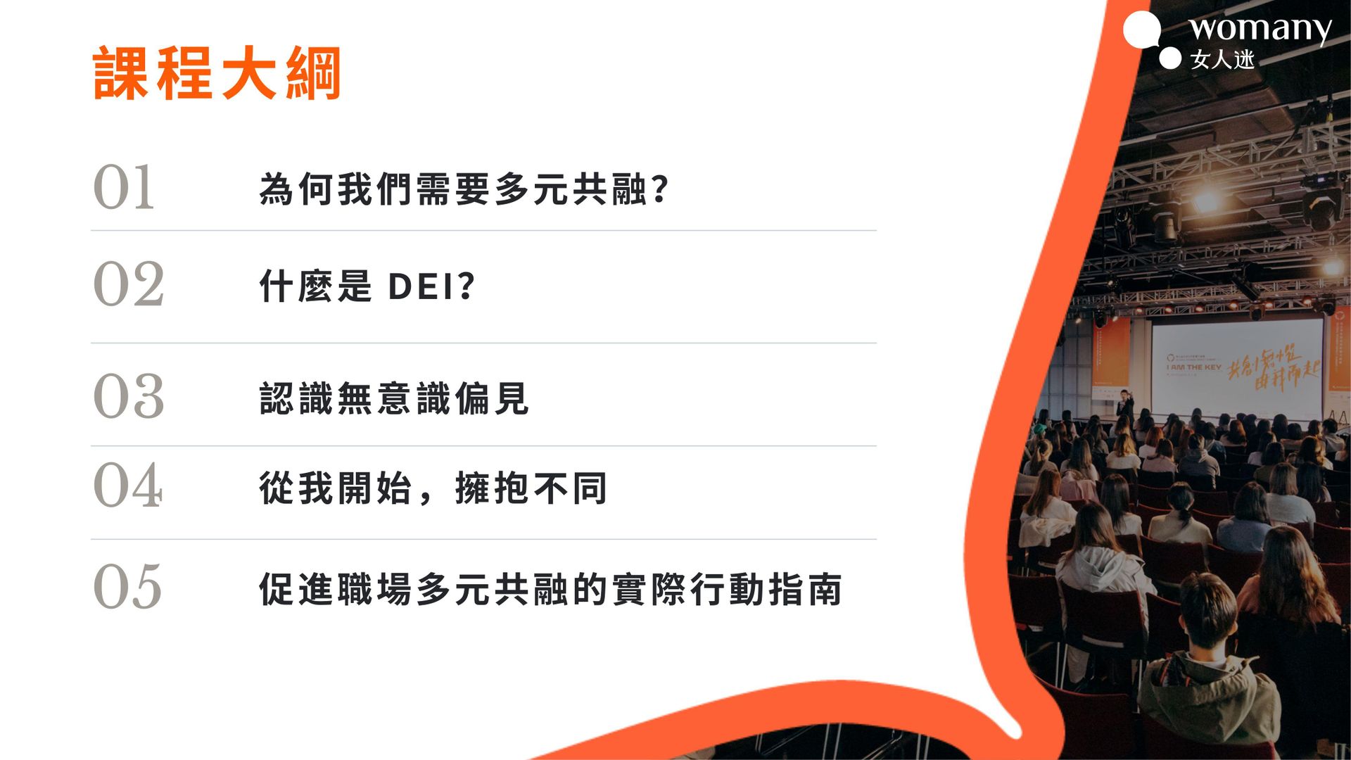 本堂課是以女人迷獨創的 DEI-I 型模組 (DEI-I model)下所設計的《多元共融文化》系列課程,讓個人與組織可以全方面的從理解 DEI 多元共融,進而到實踐在職場當中。