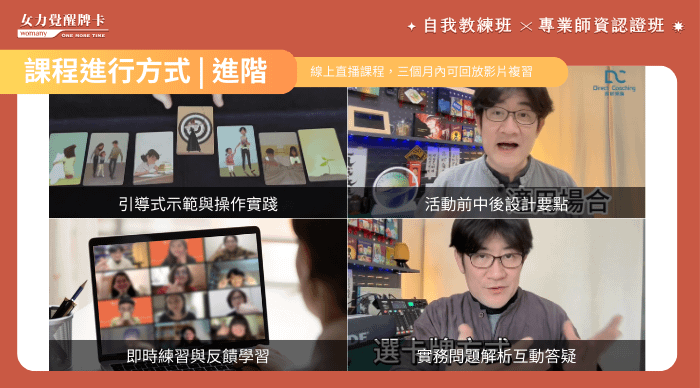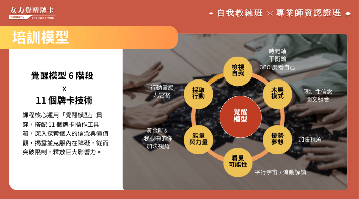 女力覺醒牌卡專業認證班,結合潛意識投射牌卡與專業教練(Coach)技巧,幫助你克服困惑、解開迷惘,開啟新視野。完成課程後,你更能用這套技術自我教練,還能進一步成為專業的帶領者,用相同的技術去輔導他人。