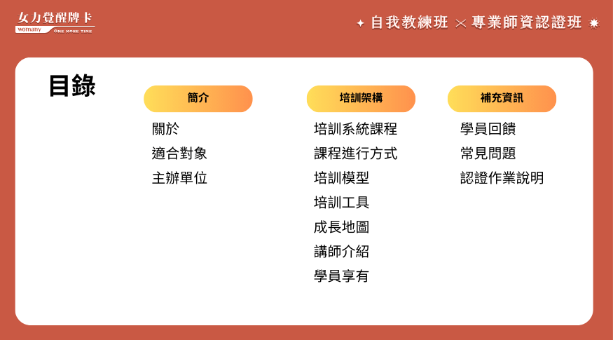 我們了解你對成長及學習的渴望,特定課程我們會提供團報媒合服務,有此需要的話邀請你來信聯繫學習助教:course@womany.net
